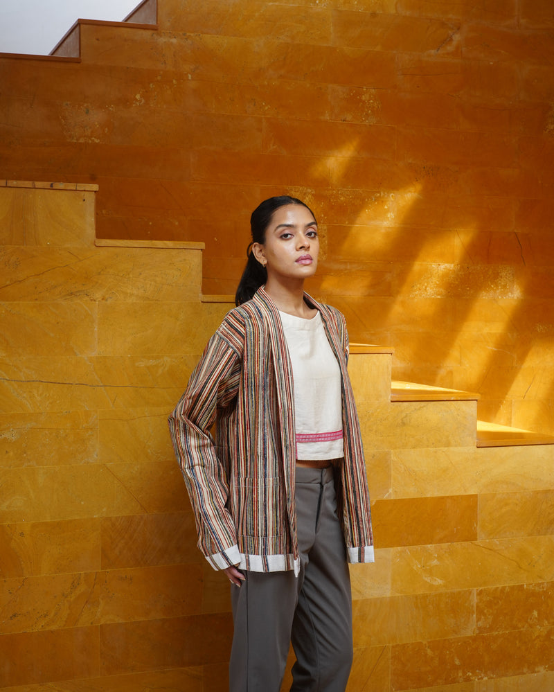 The Surajmukhi Unisex Jacket is curated in the most joyous colours just like its name. Whether it is a breezy autumn day or a cold winter morning, layer it for warmth and style. The stripes meet into angled patterns on the border for an opulent feel. It is made from pure rainfed cotton and coloured with natural plant dyes. Elevate your casual top and dresses with this limited edition jacket - designed to celebrate every body type.